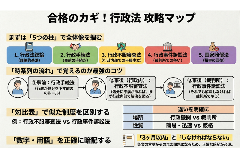 まずは「5つの柱」という全体像を掴み、「手続→不服→訴訟」という流れで知識を整理しましょう。そして、対比学習と条文の正確な暗記を徹底すれば、行政法は確実に得点源に変わります。