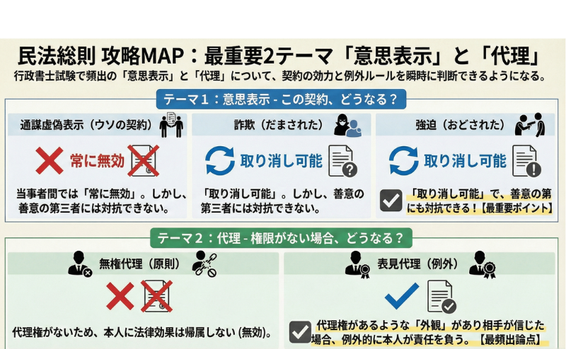 この記事では、民法総則の最重要テーマである「意思表示」と「代理」について、試験で狙われるポイントを中心に、初学者でも理解できる攻略法を解説します。