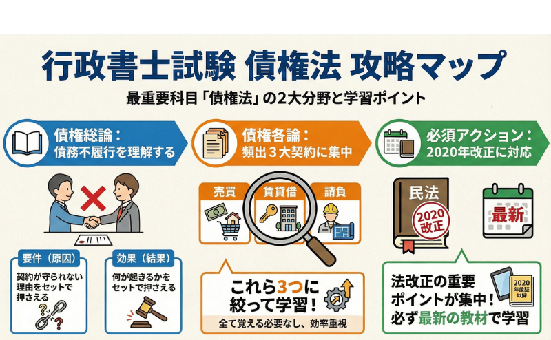 債権法はボリュームが大きいですが、闇雲に暗記する必要はありません。「債務不履行」という軸を理解し、「売買、賃貸借、請負」などの頻出契約類型に集中して学習すれば、行政書士試験の強力な得点源となります。