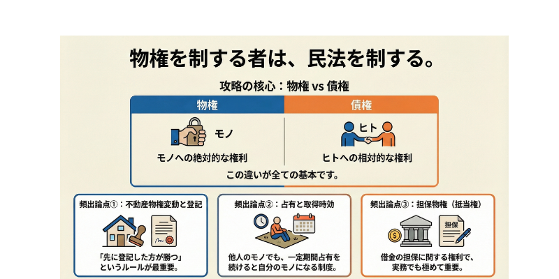 攻略のコツ:物権は「モノ」、債権は「ヒト」にまつわる権利だと割り切り、「誰に対しても主張できる権利(物権)」の特殊性を理解することが重要です。この基本を押さえておけば、複雑な論点も整理しやすくなります。