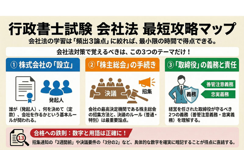 以下の3論点を確実に押さえれば、会社法で必要な得点を効率的に確保できます。それ以外の枝葉の論点に深入りするのは、時間対効果が低いため避けるべきです。