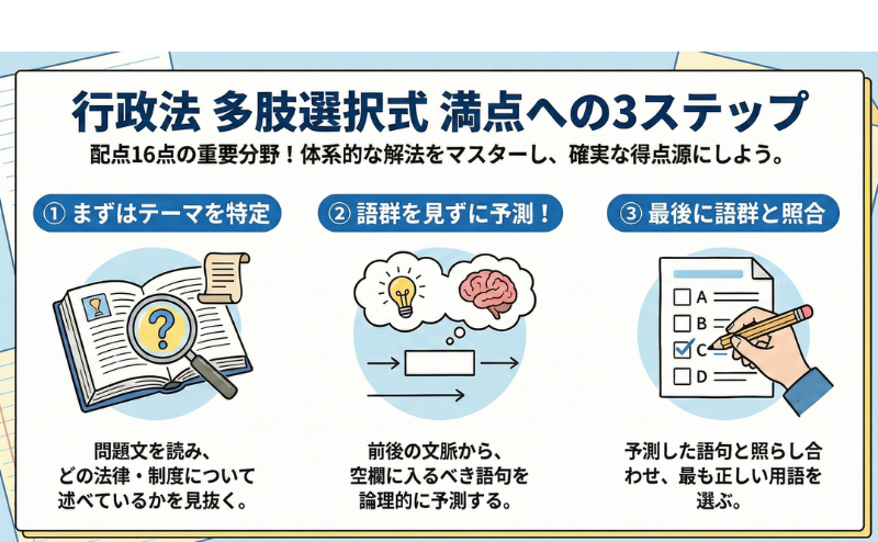 行政法の多肢選択式を攻略するには、論理的な手順に沿って解くことが重要です。以下の3ステップを実践してください。