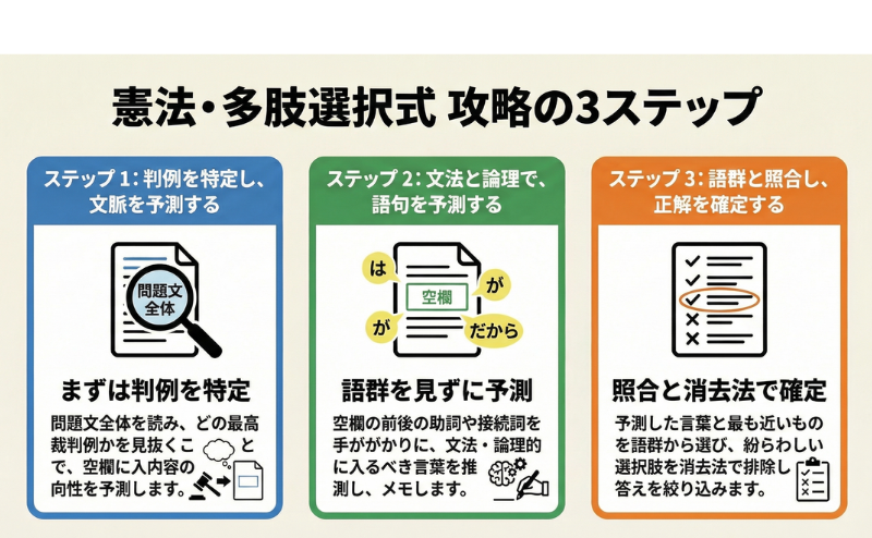 憲法の多肢選択式は、やみくもに語群を見比べるのではなく、判例知識と論理的分析を組み合わせることで正答率が飛躍的に向上します。
