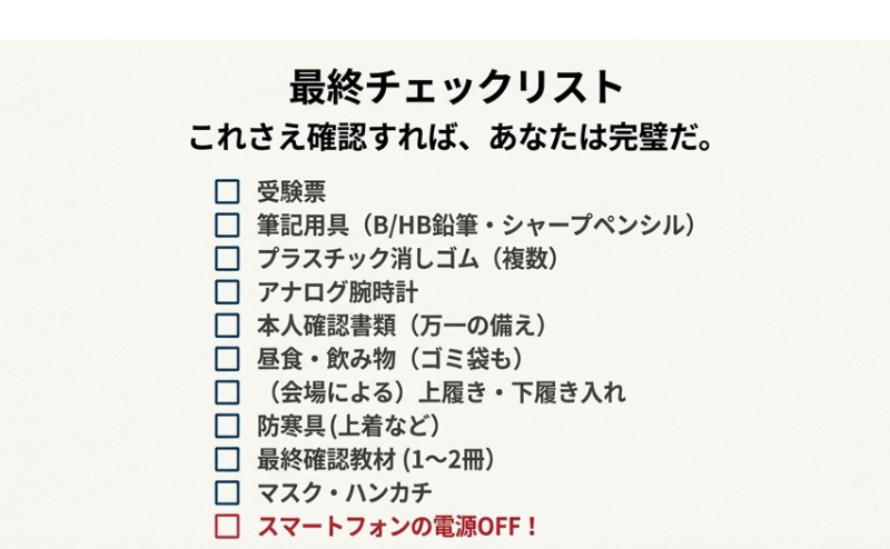 何ヶ月間も積み重ねてきた努力を、試験当日に最大限発揮するために、持ち物の準備は完璧にしておきましょう。この記事のチェックリストを活用すれば、余計な焦りなく試験に臨むことができます。受験生の皆様の合格を心よりお祈りしています。