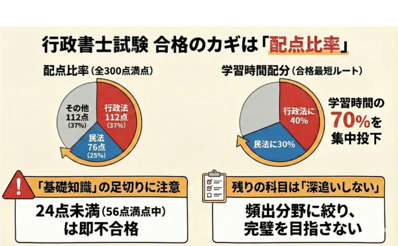 実は、行政書士試験の合否を分けるのは、勉強時間の総量ではなく、その「配分」です。全300点満点のうち、どこに集中投資するかという戦略的な判断こそが、最短合格への鍵となります。