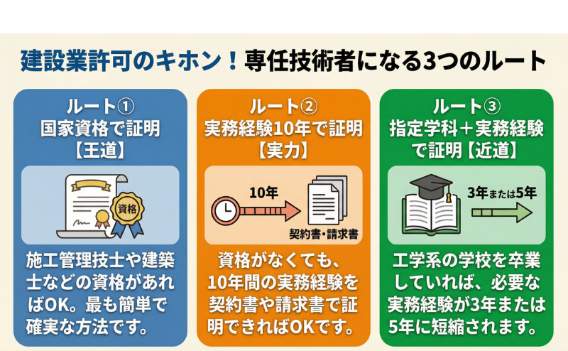 一般建設業の専技になるには、以下の3つのパターンのいずれかを満たす必要があります。